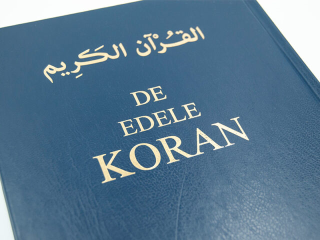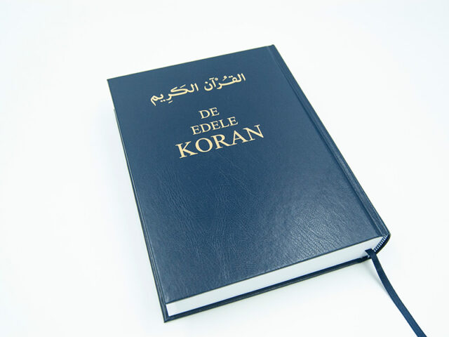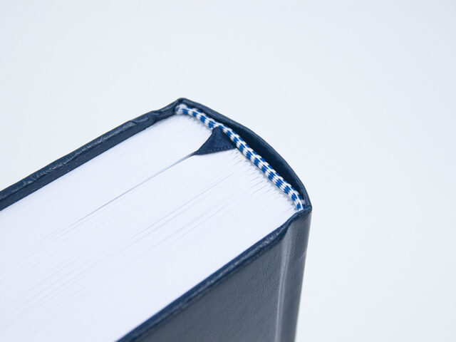 On a book with a leather cover, you can have the title embossed in foil, as seen with this beautifully crafted Quran featuring blue leather and gold foil stamping.